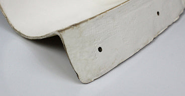 Before starting the lay-up of the mold, parting flanges or dams must be added to the plug along all the parting planes previously described. This is the form that divides the mold segments during construction. This form is removed once one side has been molded. Like the plug itself, these parting flanges are constructed of the least expensive materials that will support the curing fiberglass later. Clay, Masonite, waxed poster board, thin sheet metal, and playing cards have all been known to work. Typically, a "snake" of clay is rolled in the palm of the hands and pressed onto the plug along the parting plane. When the symmetry is simple, a silhouette cut-out can be made from Masonite and attached with the clay. It is easier to use the poster board, or playing cards on plugs with complicated shapes. Scissors can quickly cut the contours necessary before the dam is inserted into the clay. Use a mixing stick to scrape away the excess clay on the side that will be molded first. More elaborate fixtures can be constructed to do the same job, however this method will provide repeatable results.