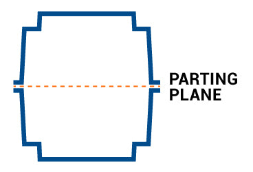 The point where the mold pieces join together is called the parting plane. This is the imaginary line that divides the negative draft angle into two positive angles. Molds can be built with as many parting planes as needed for complete separation. The plane typically runs along the highest or widest crest of the plug. When first tackling mold building projects, it is helpful to draw the line on the plug with a felt tipped pen. This permits trial-and-error sketching until you are satisfied that it is located in the proper place. If further lessons are necessary, look at the mold seams on plastic children's toys. They are often quite exaggerated and rarely removed. A lot can be learned from these examples.