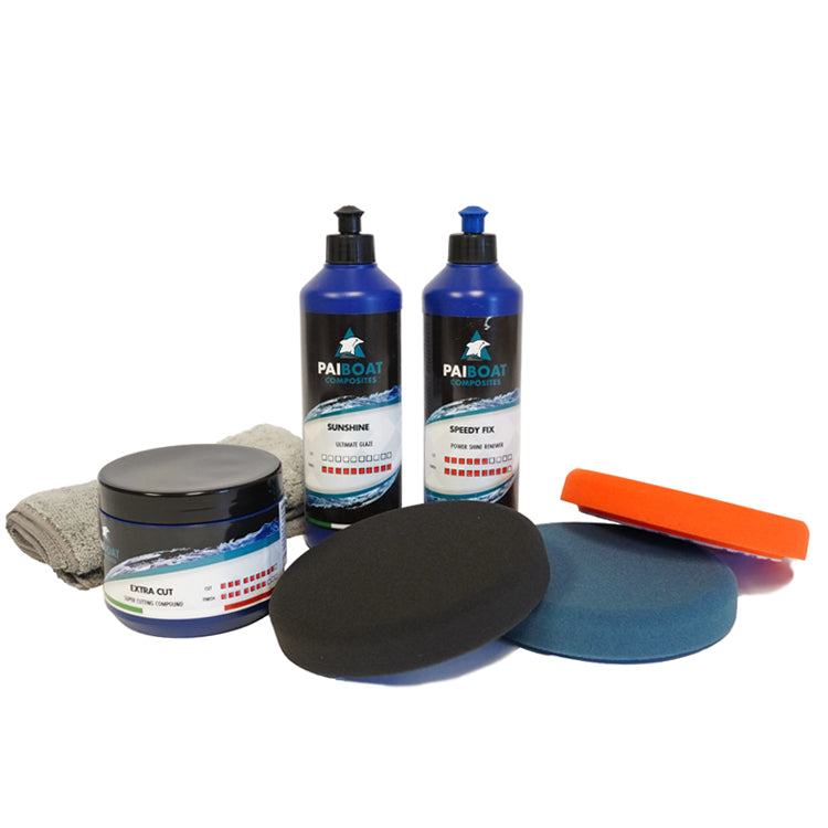The All-in-One kit contains everything you need in order to remove yellowing and scratches on your boat and restore the original deep color and shine.