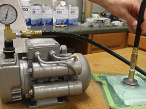 Vacuum Bagging: By adding pressure to a laminate, excess resin can be eliminated which will reduce overall weight and optimize strength. To add pressure without crushing the part, vacuum bagging is used. By placing the part in a bag, a sealed area is created into which vacuum can be run. The resulting vacuum pressure squeezes out excess resin. A vacuum pump is required and the process is usually conducted while the part is in a mold.