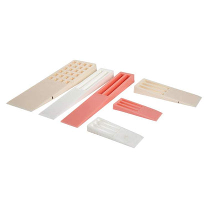 Wedges are made of soft polyethylene, so as to not damage the mold or the part. White wedges are more rigid in nature, the pink are slightly more flexible.